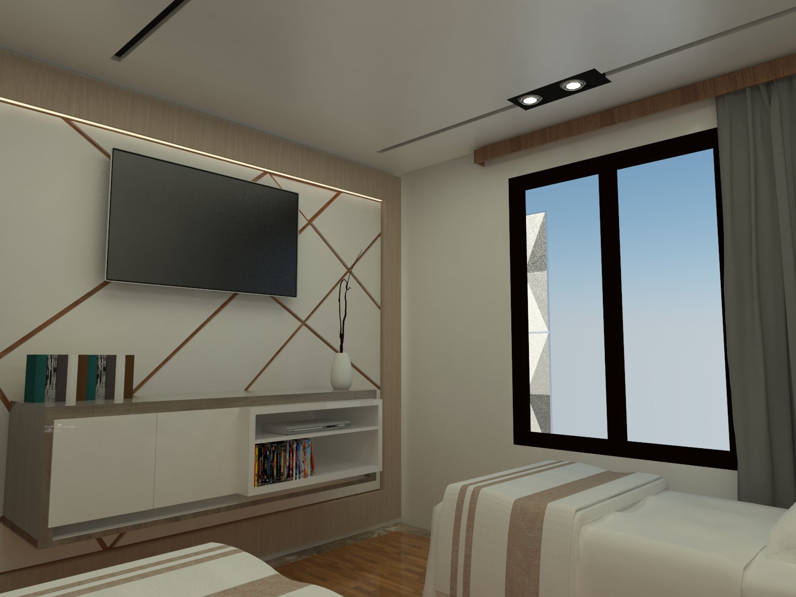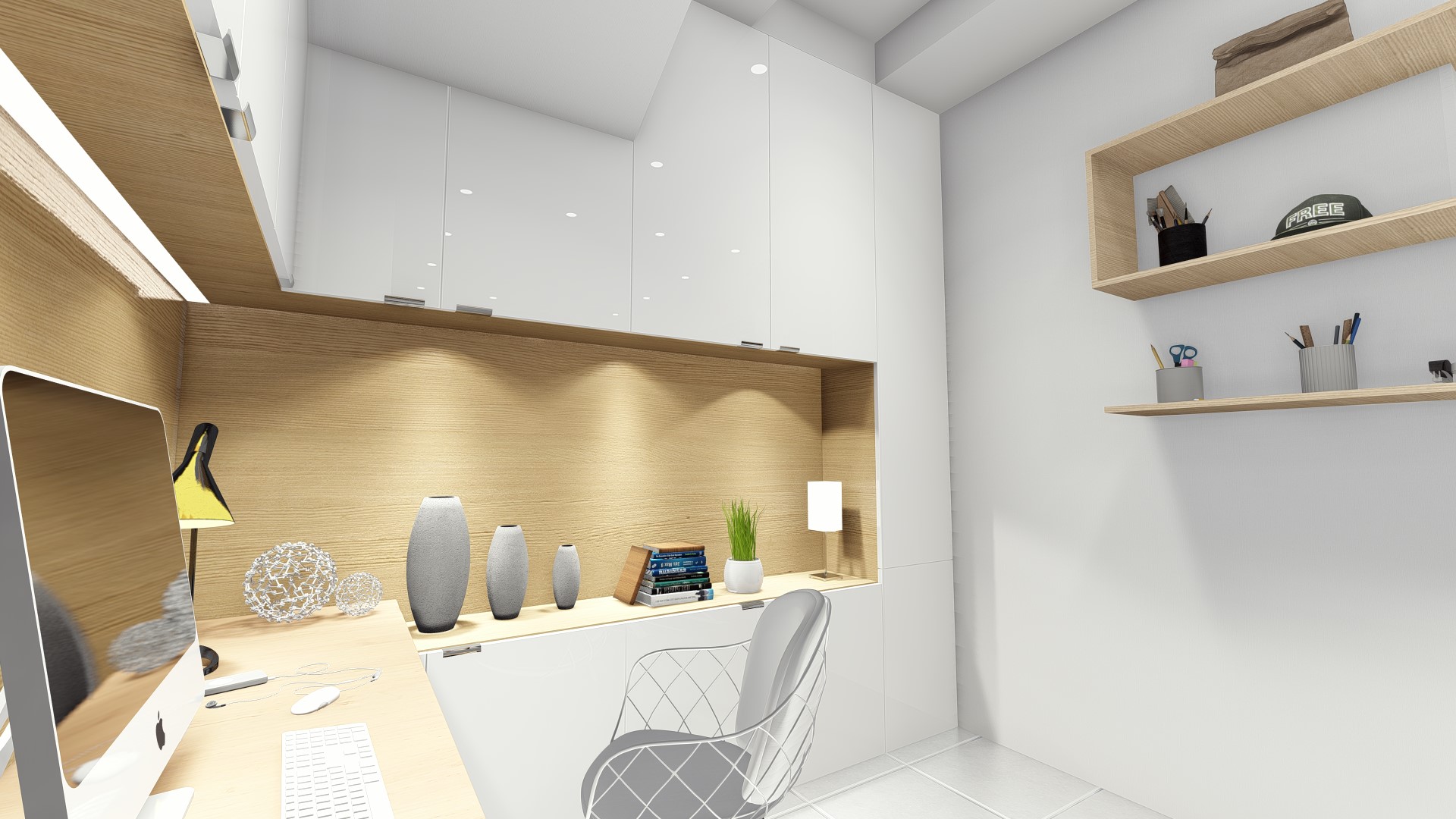 The design for this particular bedroom is scandi with little modernism. This bedroom used all white color to give the large perspective to the user with additional wood color as to make balance and cozy look.