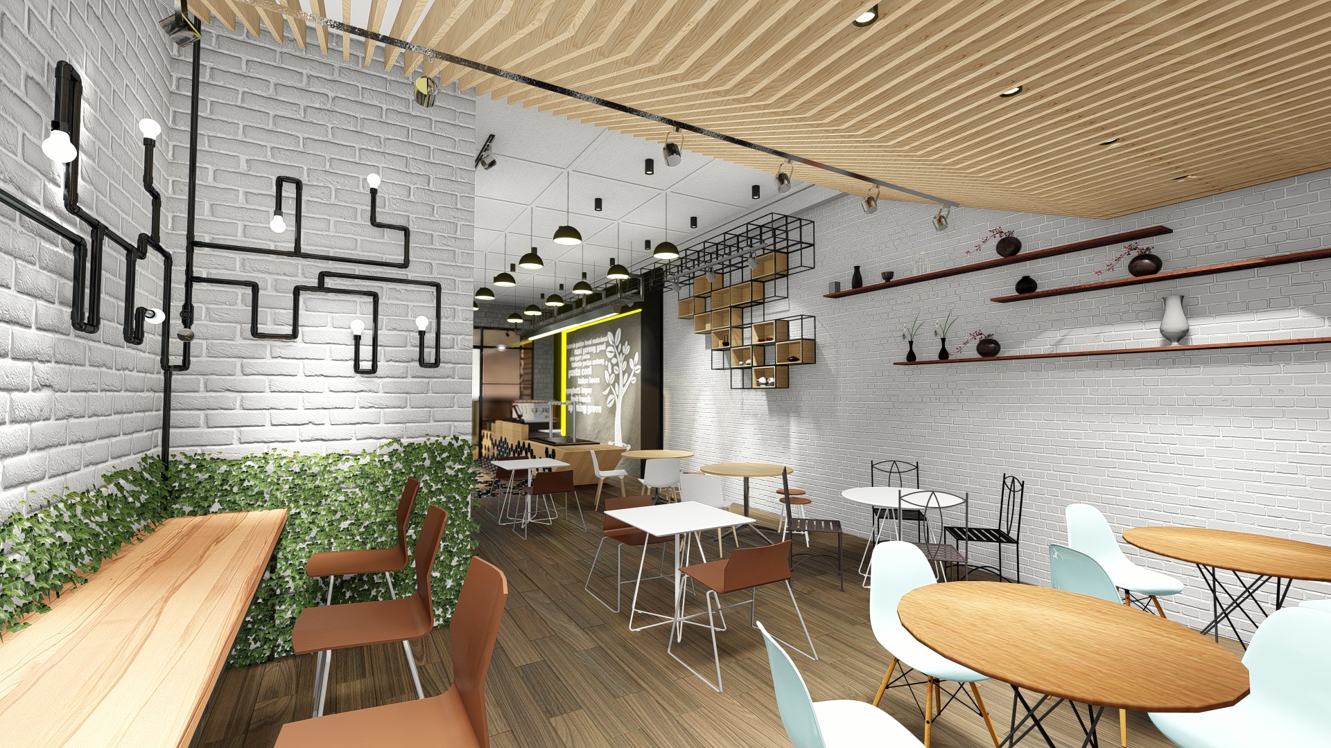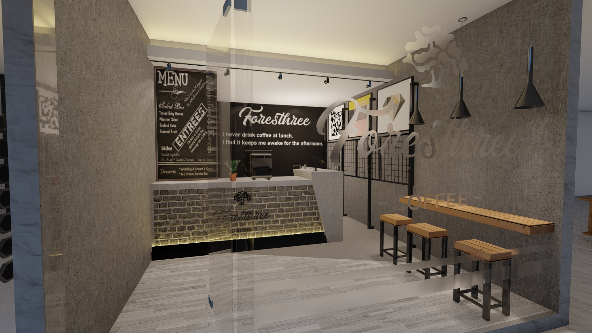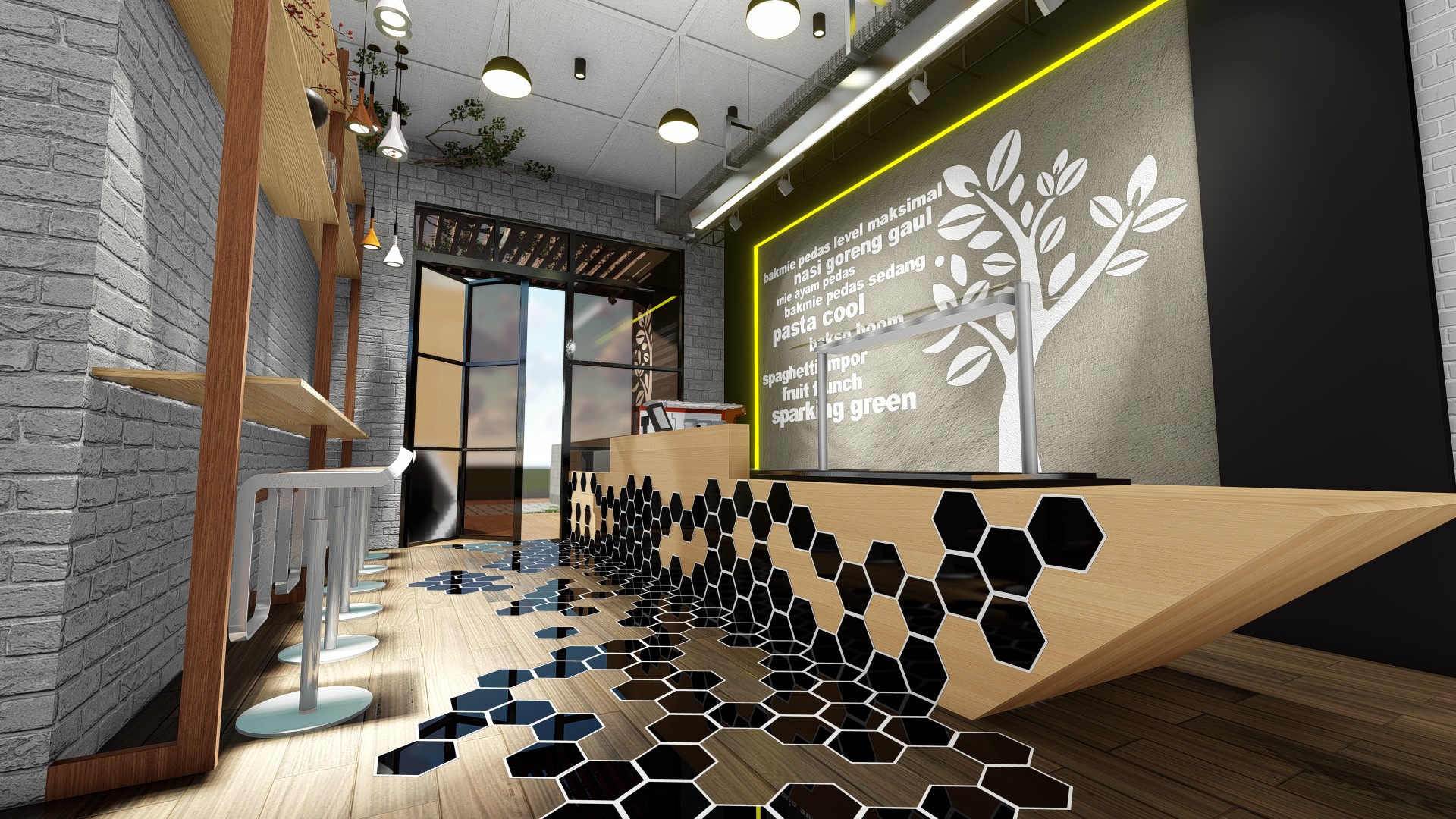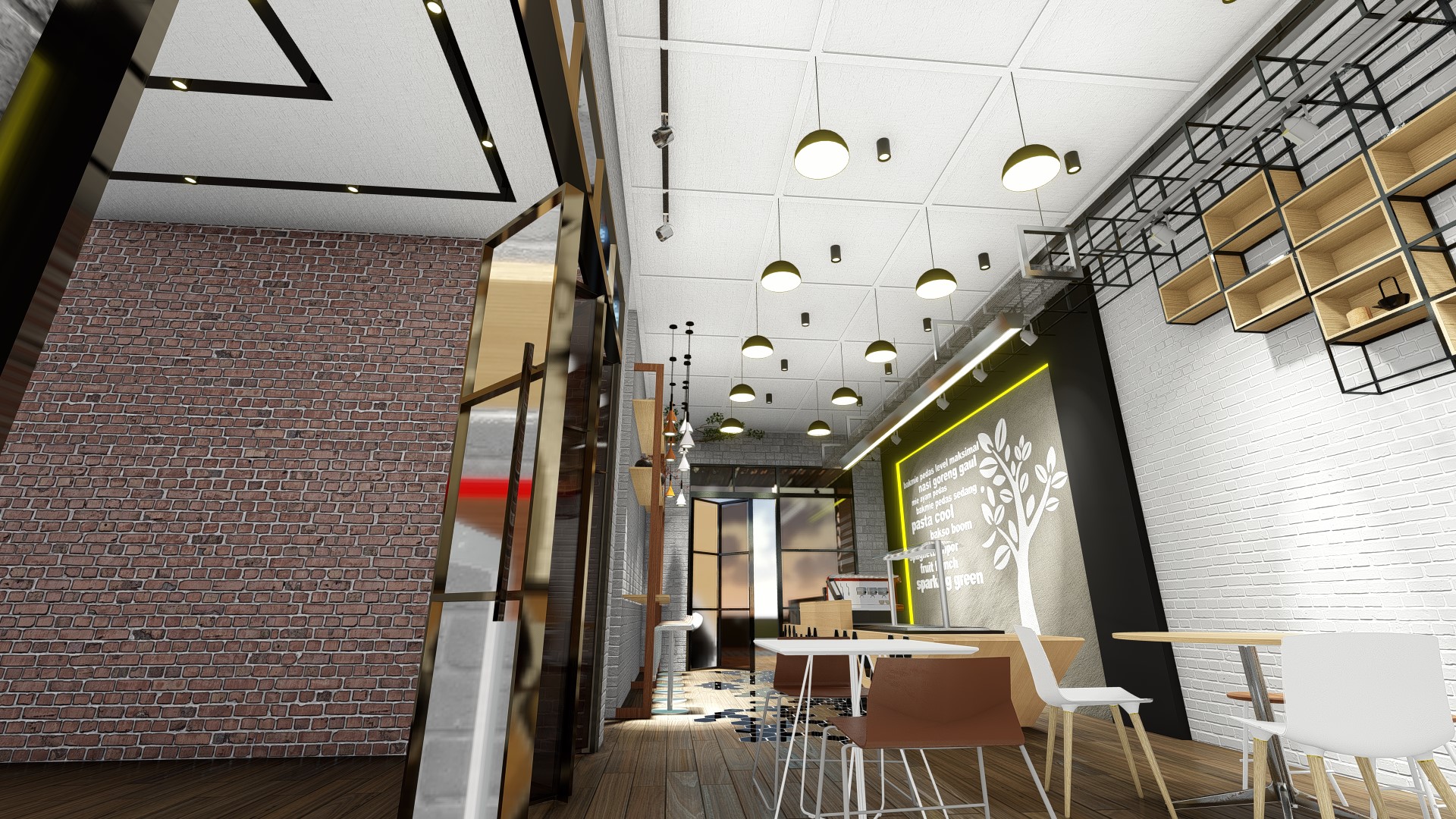 Jakarta, Design Located in the highrise building in Sudirman, Jakarta, the size of the coffeeshop could be said really small. With this limitation we try our best to still provide customer with waiting room, dine in option as well as providing enough spase for bar, storage room and rest room for the employee.