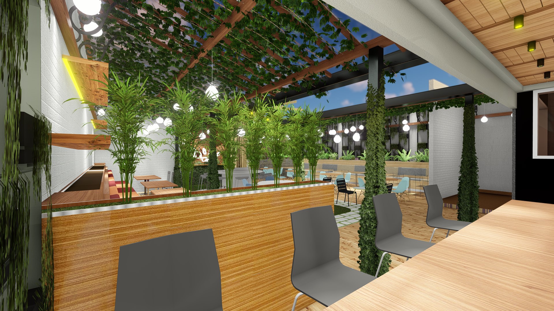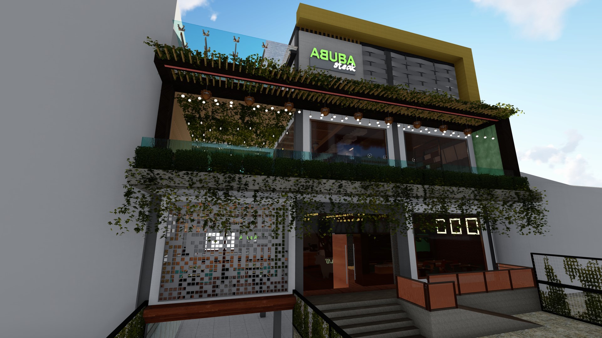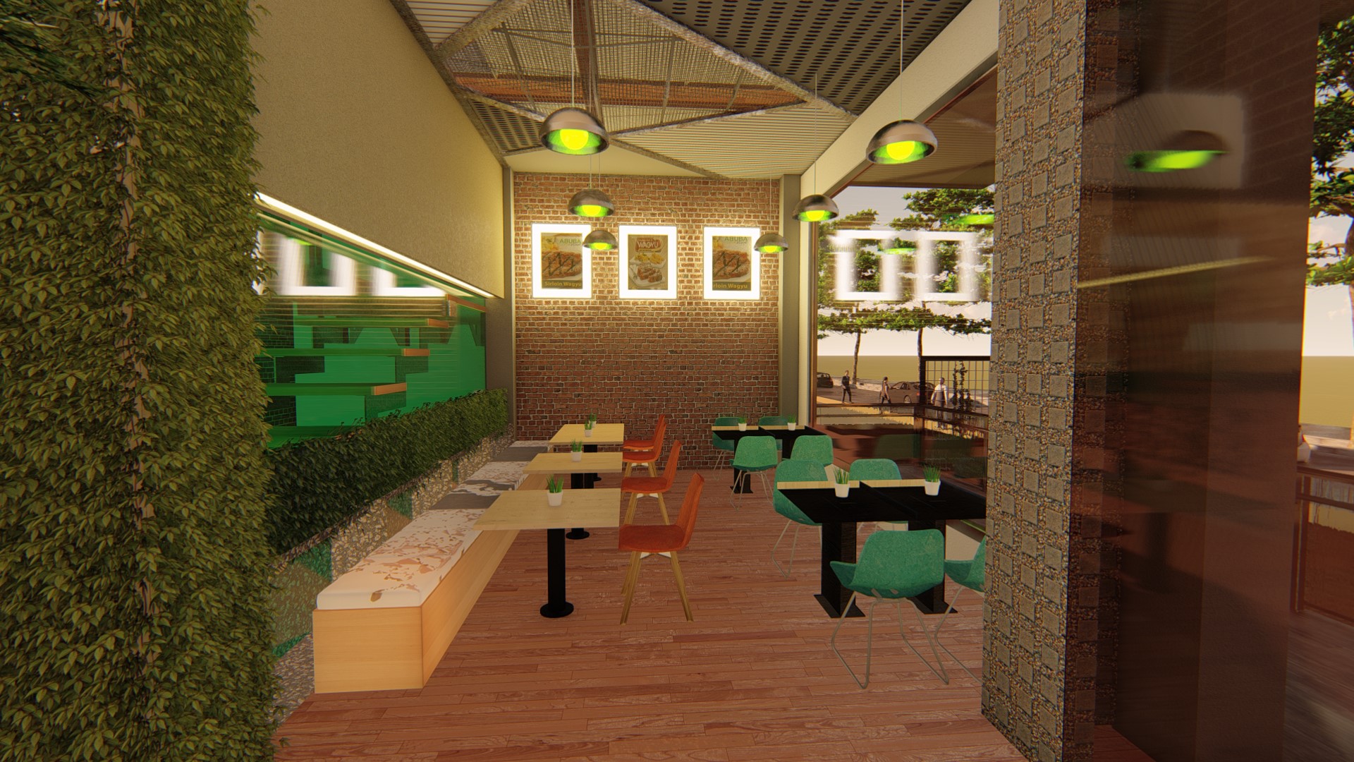 The design concept used for this chain restaurant tropical modern while still maintain the main fiture of the restaurant in the façade are. High ceiling, roster, natural ventialation and natural light could pass the building to increse the comfort level for the customers. Natural raw finished material, expose material, wood and steel used to embrace the beauti of natural element as the restaurant used natural and fresh ingredient for their food menu.