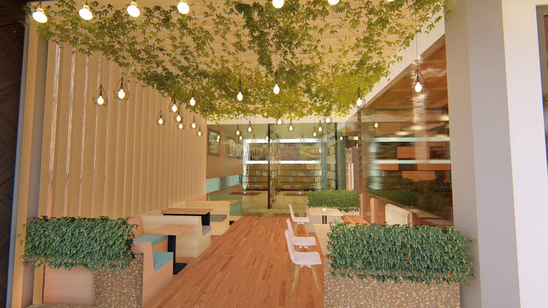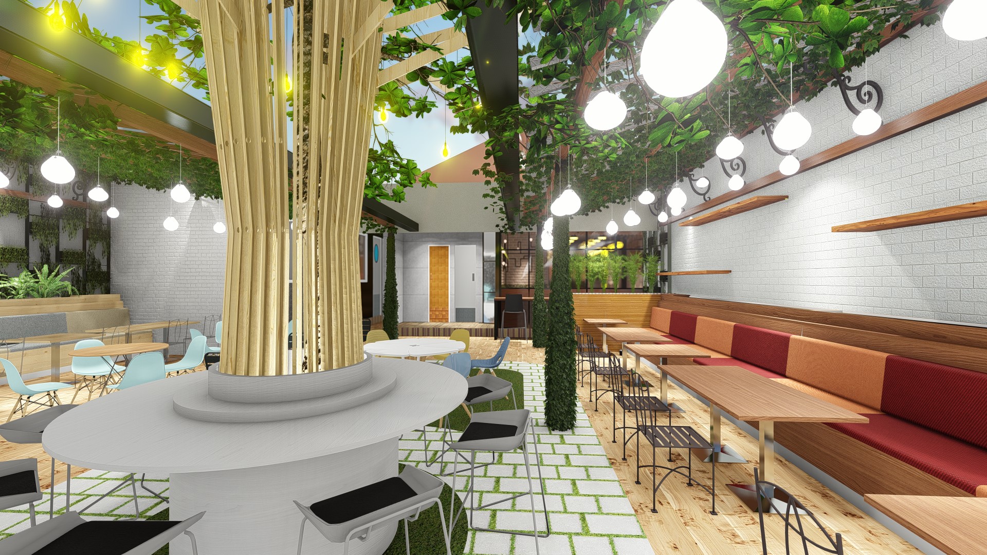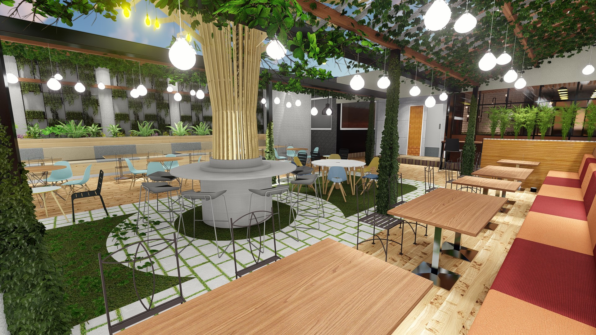 The design concept used for this chain restaurant tropical modern while still maintain the main fiture of the restaurant in the façade are. High ceiling, roster, natural ventialation and natural light could pass the building to increse the comfort level for the customers. Natural raw finished material, expose material, wood and steel used to embrace the beauti of natural element as the restaurant used natural and fresh ingredient for their food menu.
