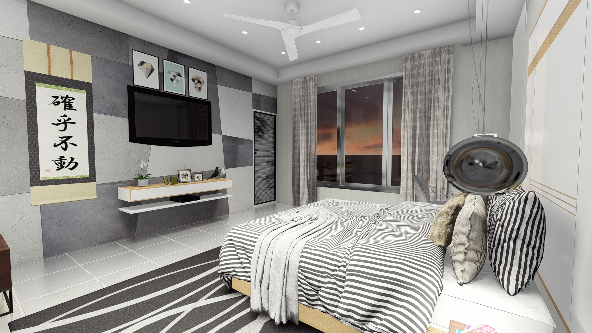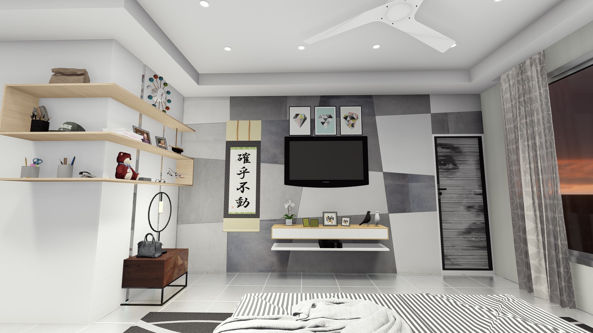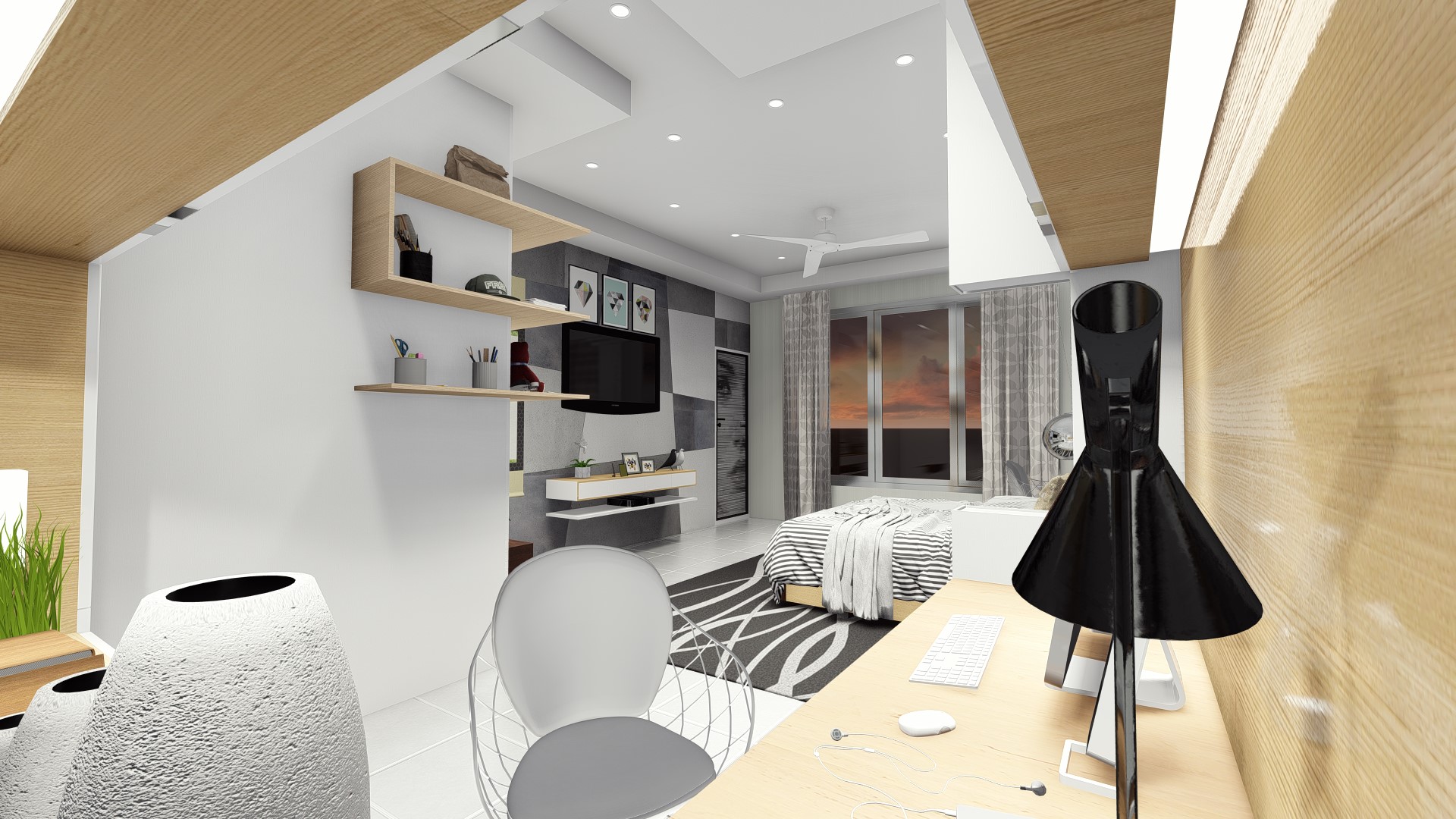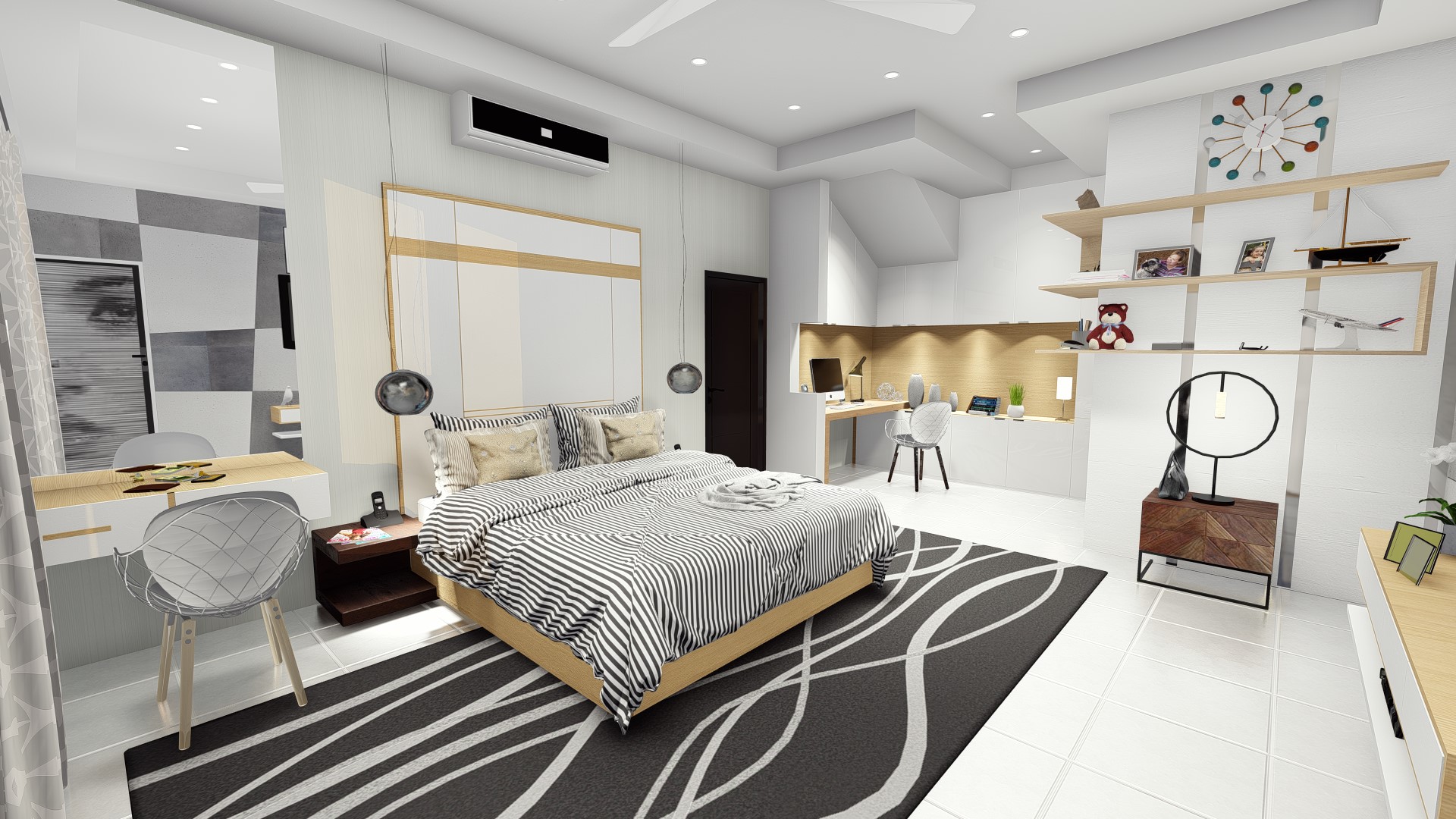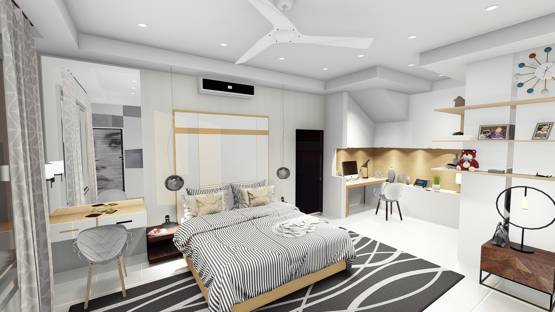 The design for this particular bedroom is scandi with little modernism. This bedroom used all white color to give the large perspective to the user with additional wood color as to make balance and cozy look. Not only used for sleep, this bedroom design also accommodate the owner a study or working space to use for WFH (work from home) station