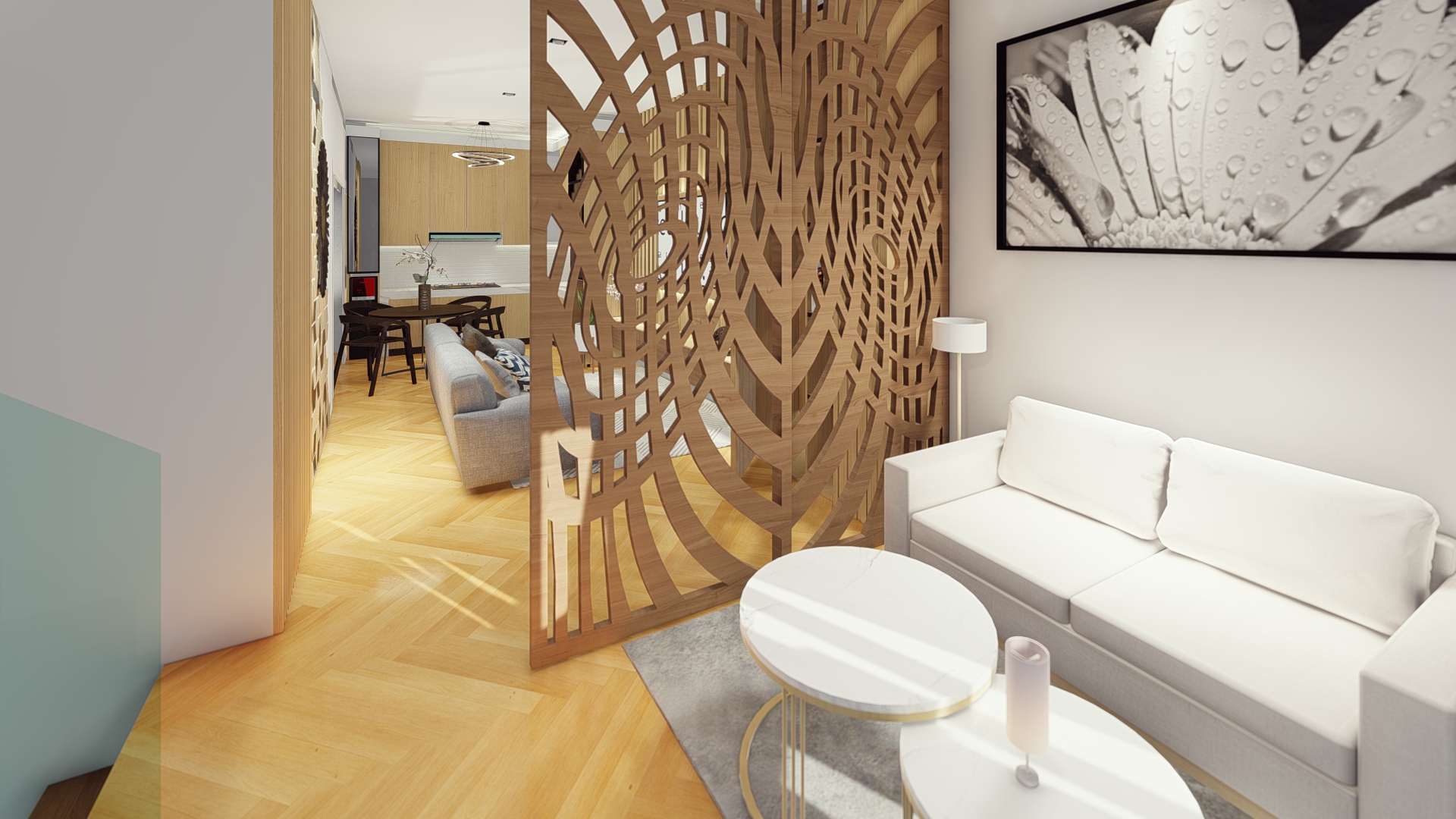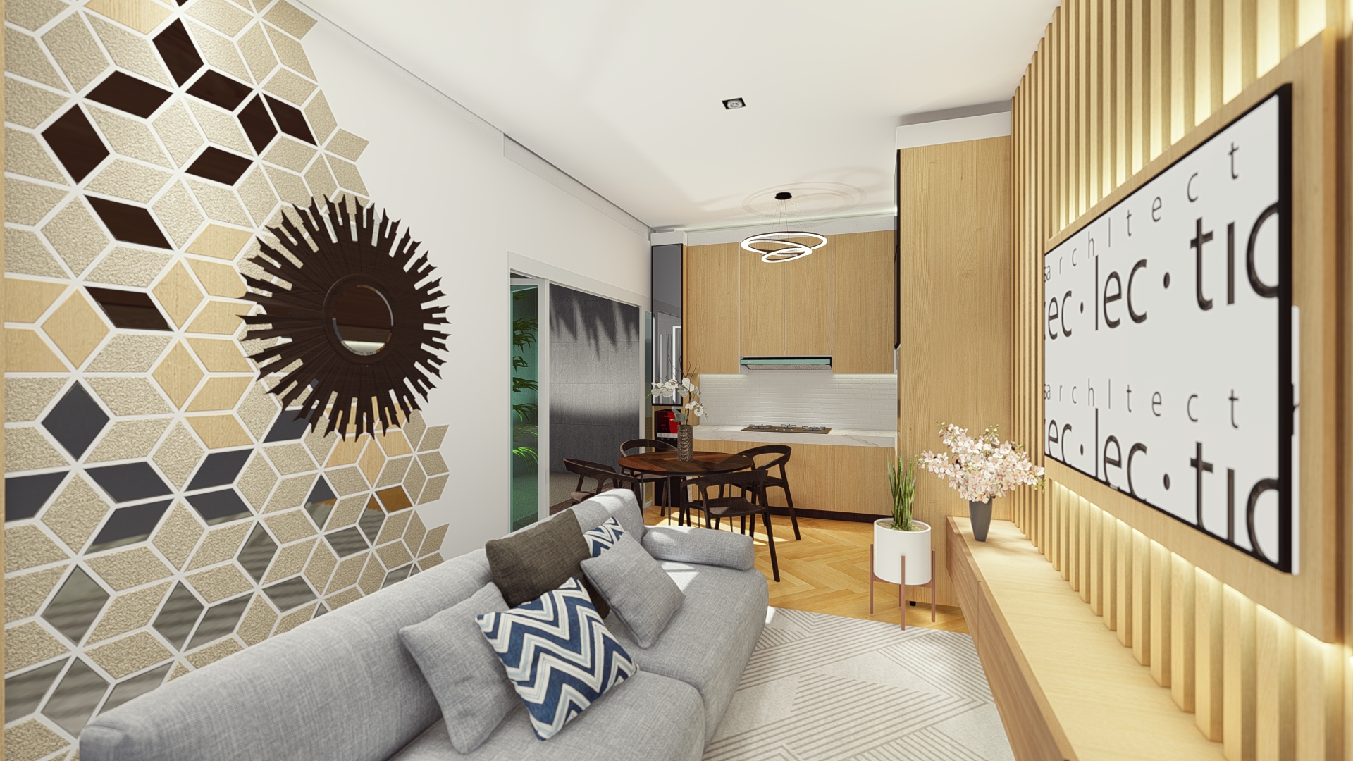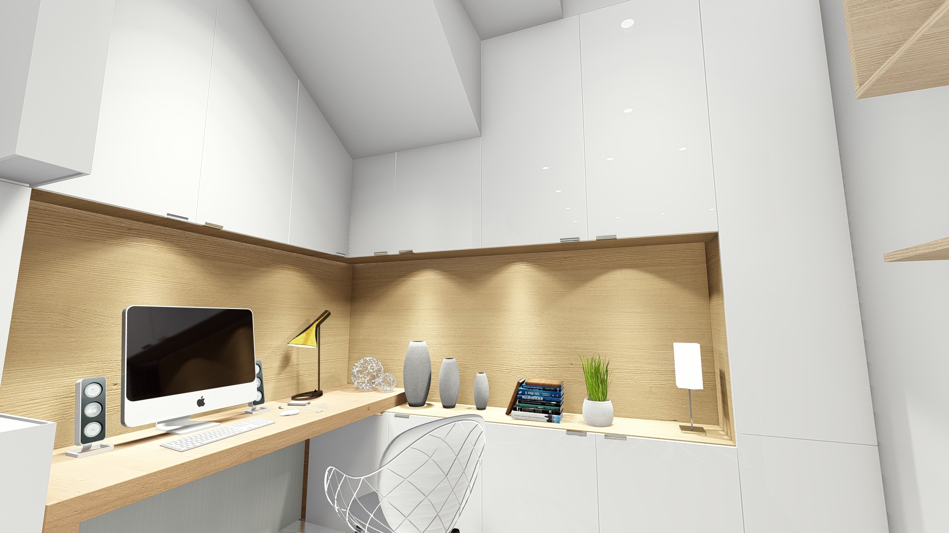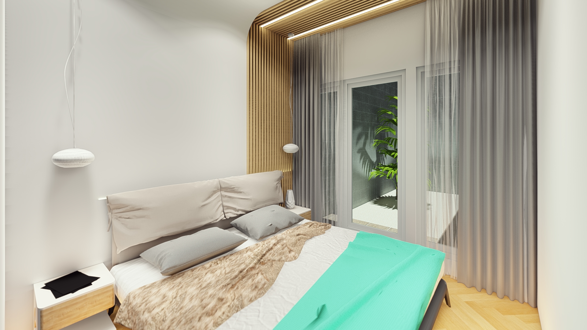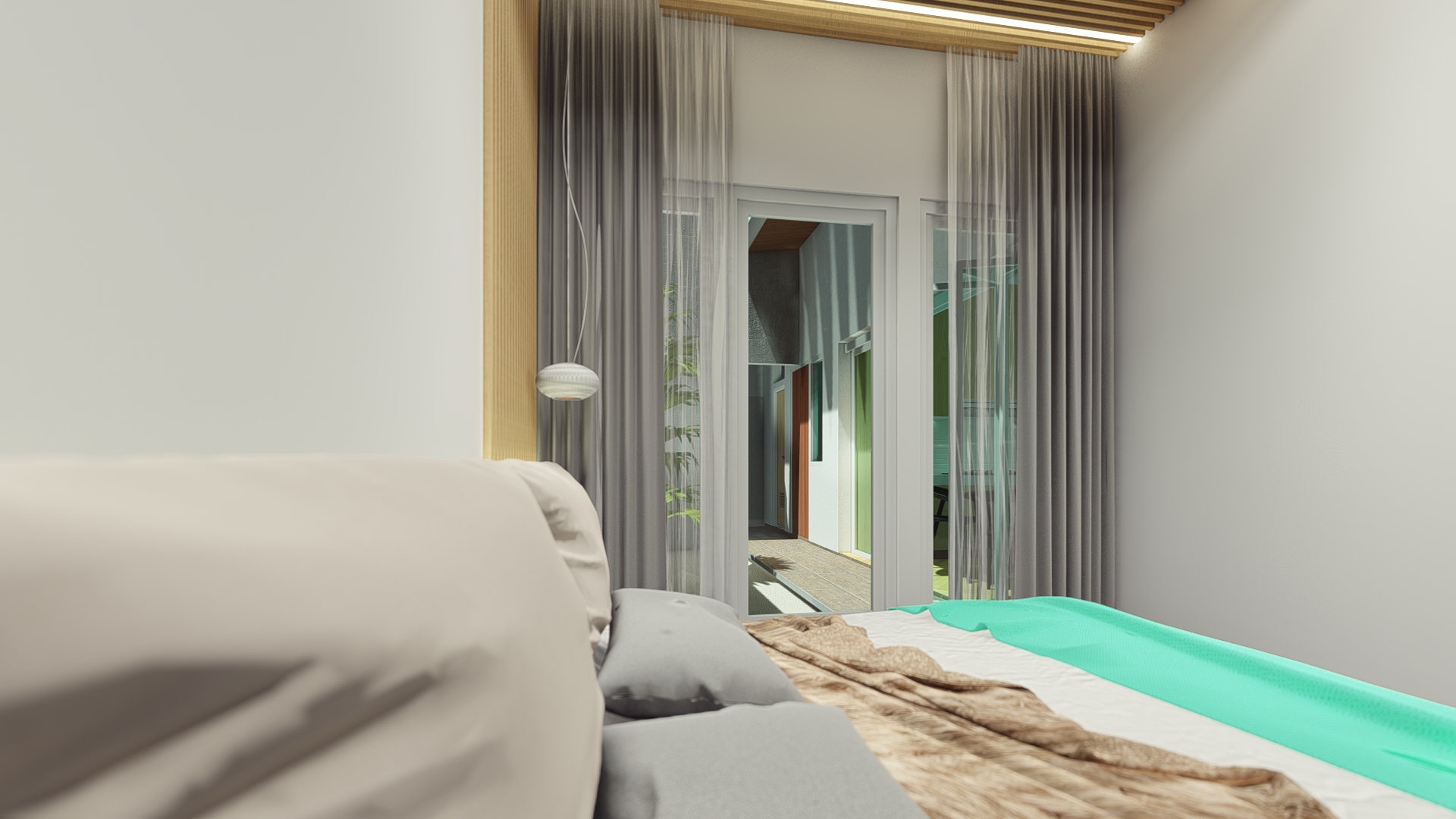 The design for this particular bedroom is scandi with little modernism. This bedroom used all white color to give the large perspective to the user with additional wood color as to make balance and cozy look. Not only used for sleep, this bedroom design also accommodate the owner a study or working space to use for WFH (work from home) station